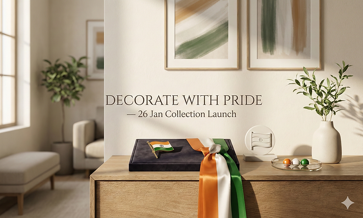 “Decorate with Pride” is our response to how people want to celebrate Republic Day in 2025: meaningful, elegant, and lasting. The collection focuses on quality items that integrate into everyday interiors — not seasonal clutter. Each piece is chosen to be wearable, displayable, or both: a indian flag brooch for men that doubles as a mantel artifact, a framed indian flag badge white decor tile that reads as art, and a handwoven tricolor sash that functions as a ceremonial sash and a stylish table runner.